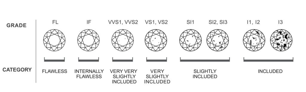 The clarity of a diamond is determined by the amount and location of flaws, or blemishes, in the diamond when viewed under 10 power (10x) magnification. GIA rates clarity grades in diamonds from Flawless to Imperfect 3 (see chart below). The Diamond Shopping Network offers you diamonds from the Imperfect 1 grade through Flawless.