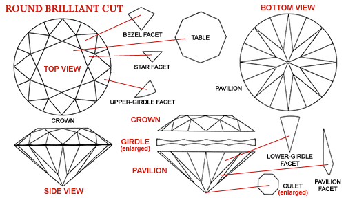 When we speak of cut we are more interested in the proportions of the diamond as opposed to its shape (Round Brilliant, Marquise, Pear, Princess, etc.) Every diamond regardless of its shape gets it brilliancy and scintillation by cutting and polishing the diamond facets to allow the maximum amount of light that enters through its top to be reflected and dispersed back through its top.